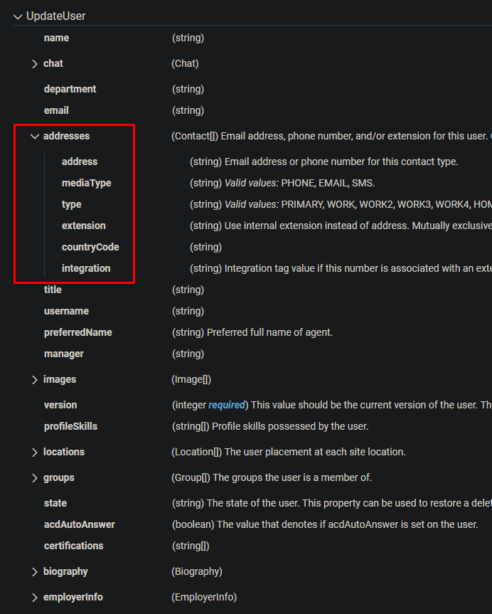 "primaryContactInfo": [ { "mediaType": "PHONE", "type": "PRIMARY", "extension": f"{extension}" } ], "addresses": [ { "address" : f"{phone}", "display": f"{e164}", "mediaType": "PHONE", "type": "WORK", "extension": "", "countryCode": "US", "integration": "directrouting" }, { "address": "", "display": f"{extension}", "mediaType": "PHONE", "type": "WORK2", "extension": f"{extension}", "countryCode": "US" } ] })
