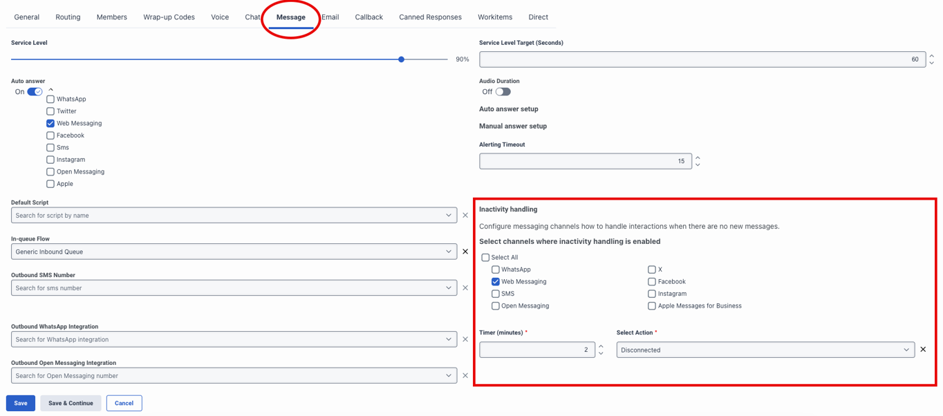 Queue configured with Inactivity Handling → Timer + Disconnect