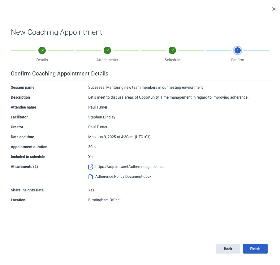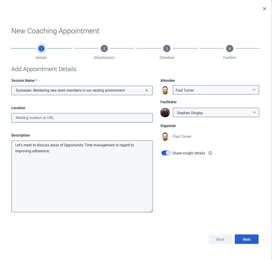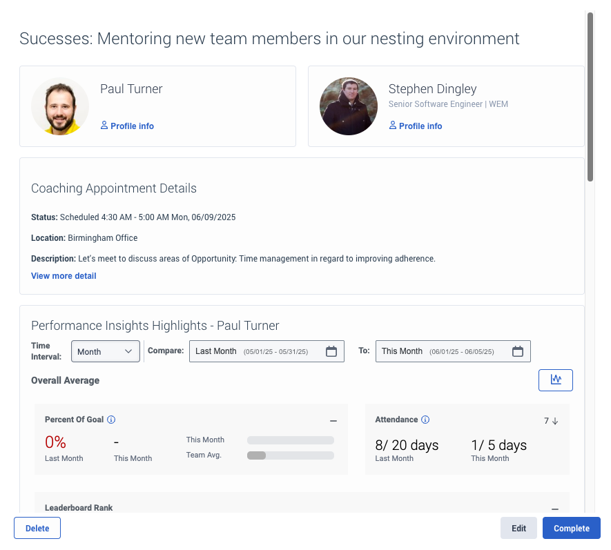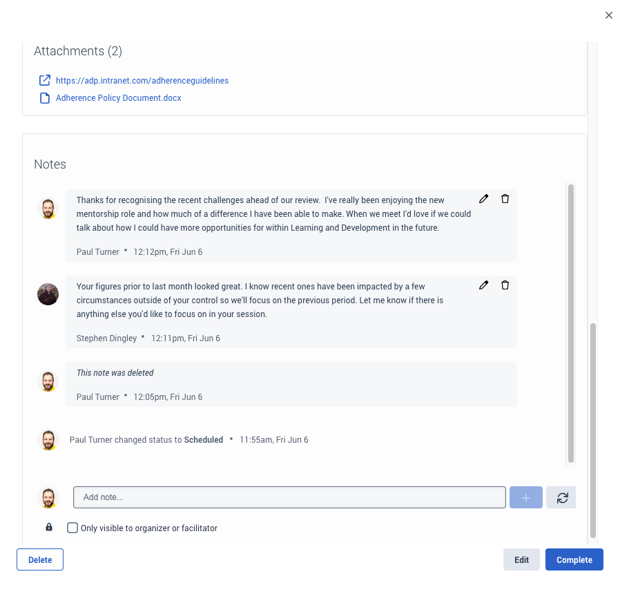 During or after a coaching session, you can capture outcomes in notes or update the description to reflect key discussion points and next steps.