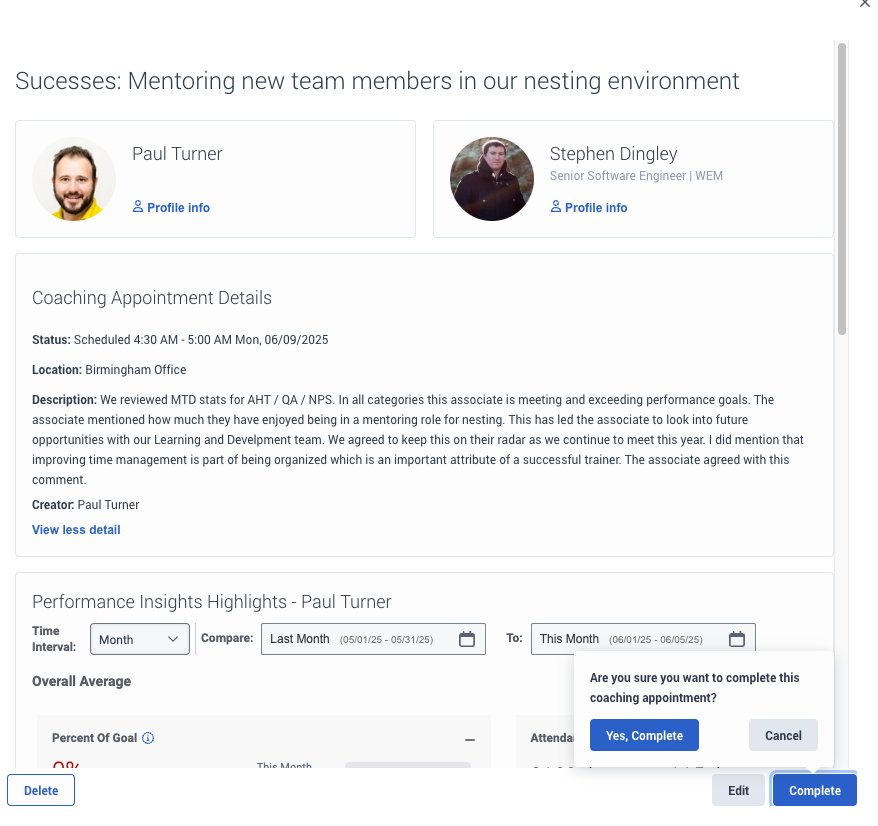 Comments: We reviewed MTD stats for AHT / QA / NPS. In all categories this associate is meeting and exceeding performance goals. The associate mentioned how much they have enjoyed being in a mentoring role for nesting. This has led the associate to look into future opportunities with our Learning and Develpment team. We agreed to keep this on their radar as we continue to meet this year. I did mention that improving time management is part of being organized which is an important attribute of a successful trainer. The associate agreed with this comment.
