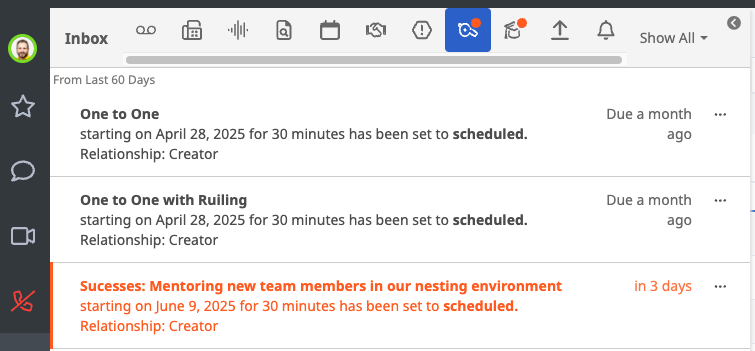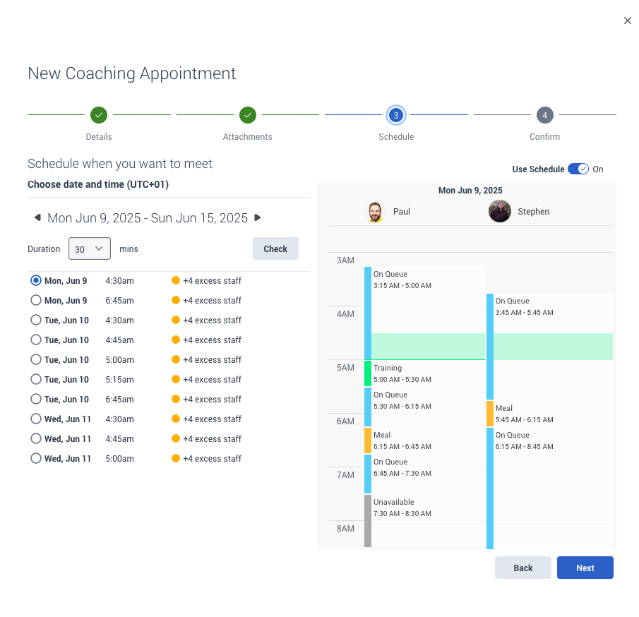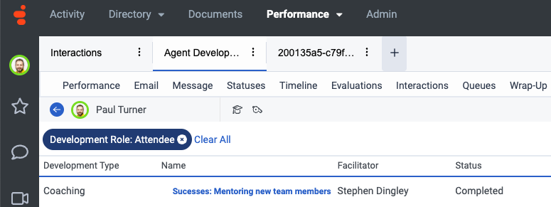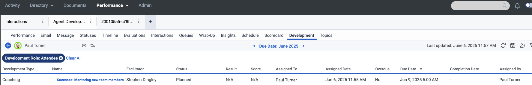 If your organisation uses Workforce Management, Genesys Cloud will suggest session times based on available interruptible activities. Once booked, the session appears in both the coach's and agent's inboxes, and is visible in the Agent Development view.