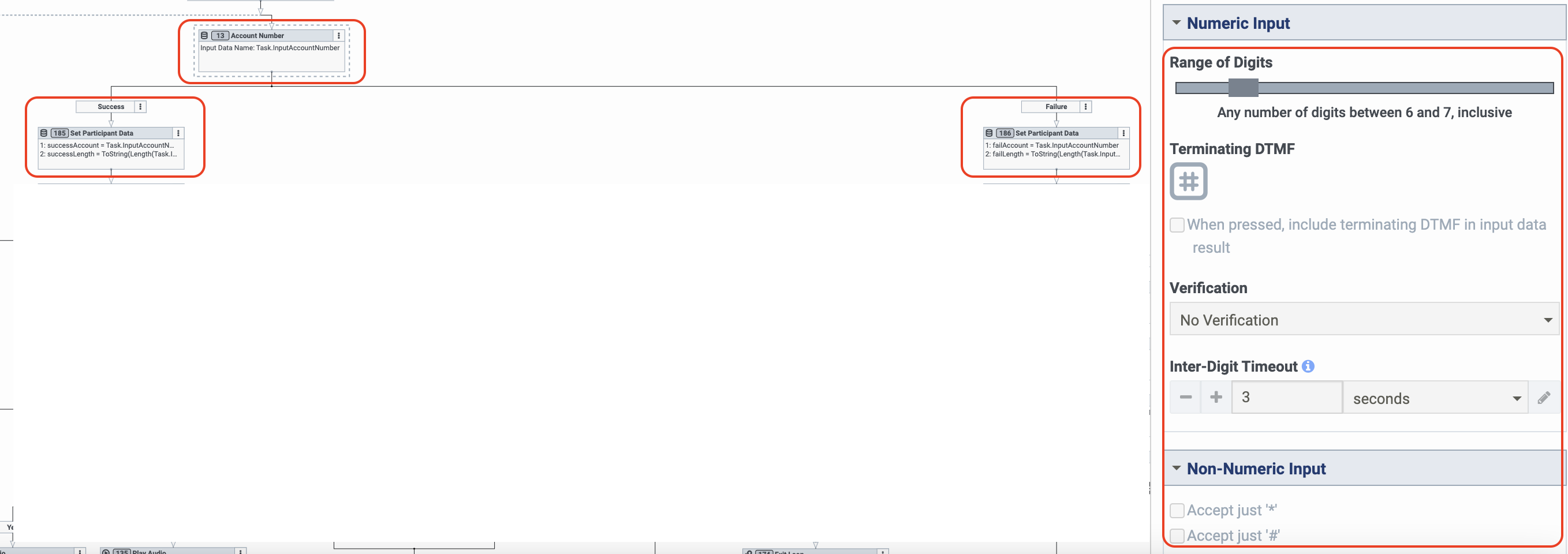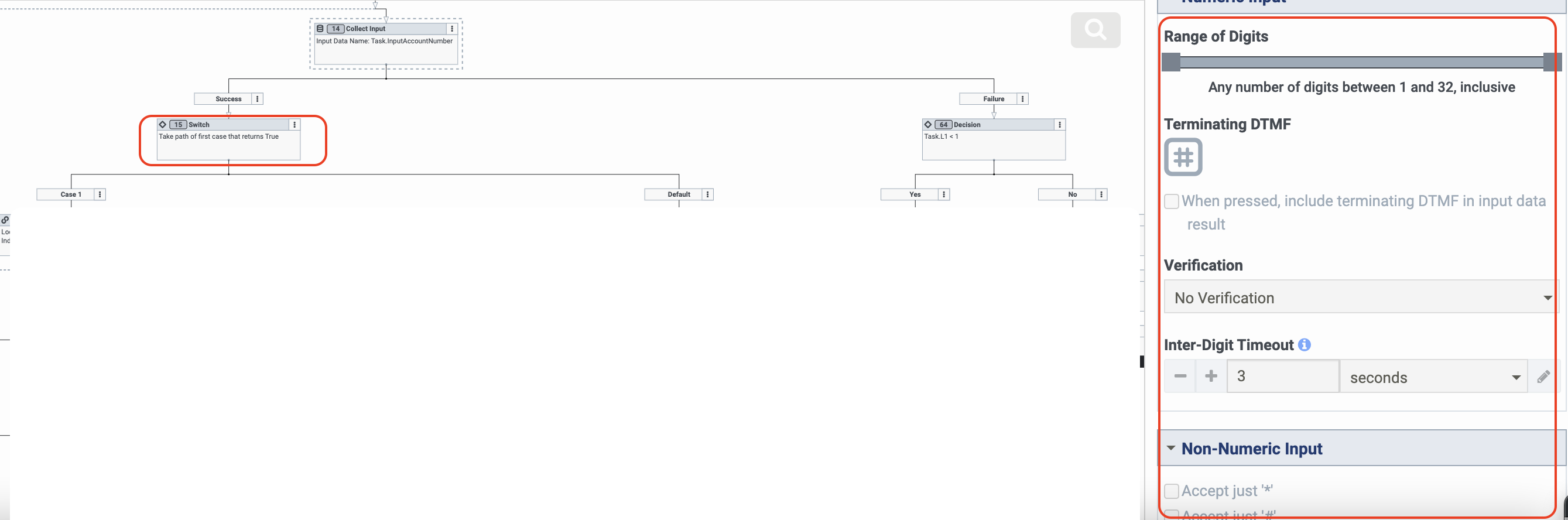 If the business wants # as terminating char then we have to use range to collect input (6 to 7) and as per the latest screen shot you are setting terminating DTMF as # and you are not including it on the result, so that means we have to check always caller input account number length is equal to 6. In case if the customer enter 1234567 it is also valid as per range, however, i'm sure that you have a check for input length and you are going back to collect the account number again. Here as per my understanding when we enter 1234567890, it is considering 1234567 as valid input and it will take success path, and here length is 7 and if you are going back to collect number again, then 890 will be considered as user input as second attempt, so it will wait for inter digit timeout (number of seconds) before it throws a nomatch, because the valid length is 6 or 7 digits. So, it will take the failure path in this case.