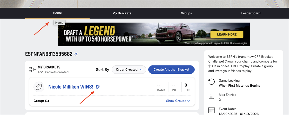- Name your bracket in a way we can identify you. To change your name, go to "Home - Click the settings icon by your name."