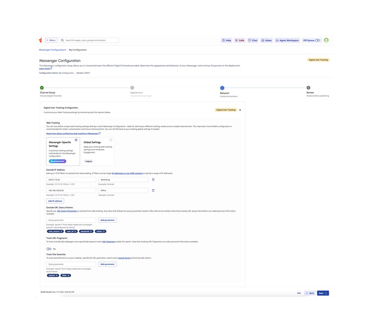 To streamline the implementation of Journey Tracking, the provisioning and configuration of Digital User Tracking will be fully integrated into Messenger Configurations. This will introduce a more intuitive provisioning