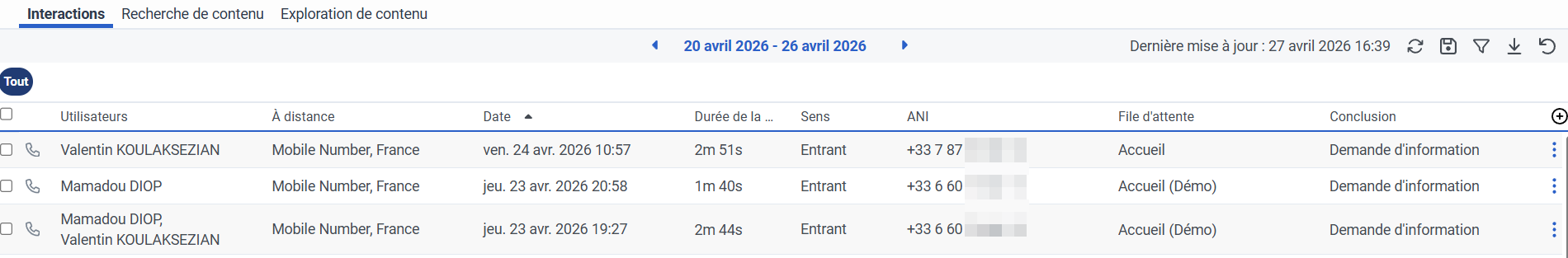 Instead, entries often show "Mobile Number France," particularly for incoming and transferred calls.