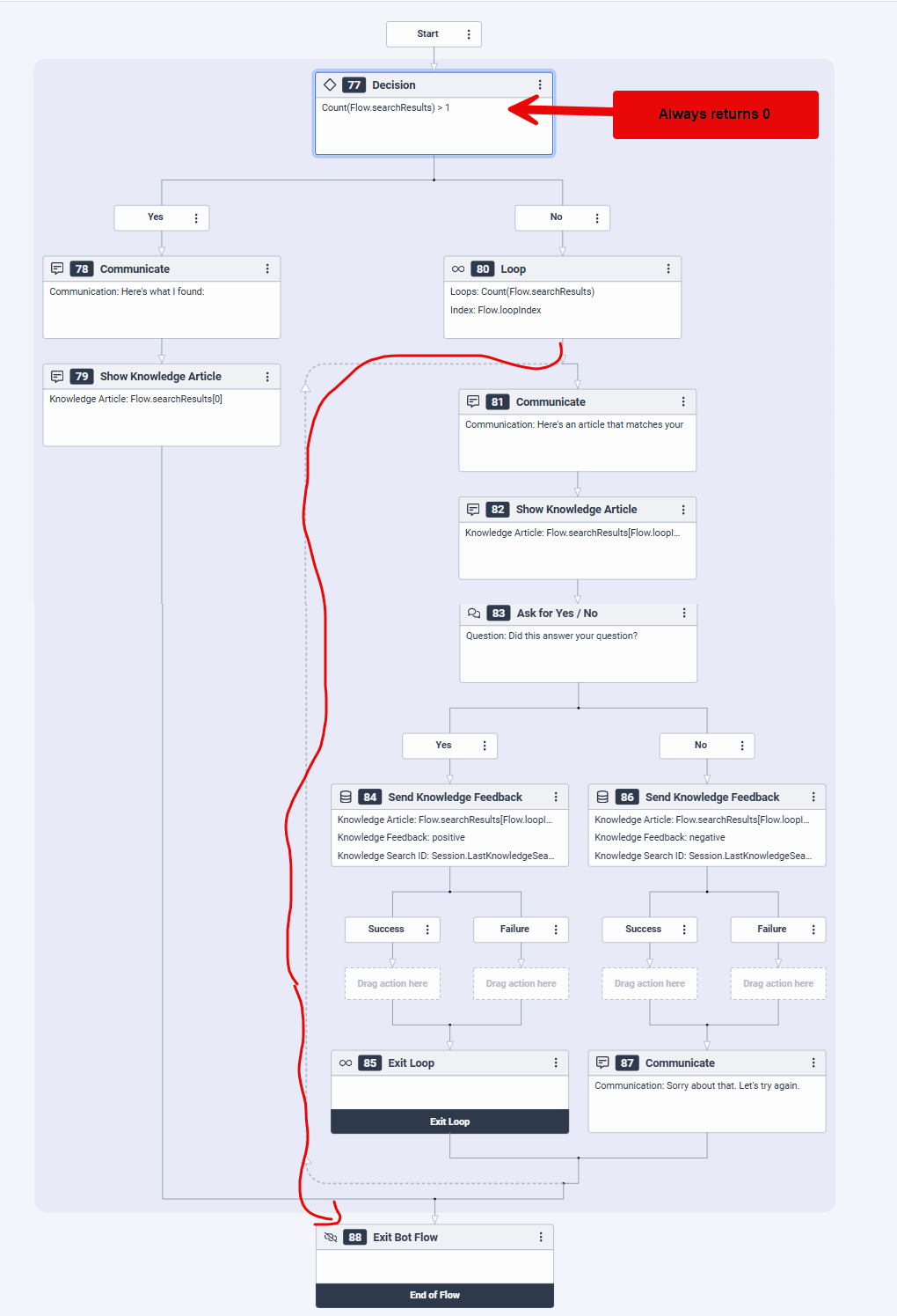 I have set this up identically to the documentation on 2 separate bots, and when I go to test it hits the No path after the Decision action but then ends the chat. I added some communication objects to see what the searchResults variable is pulling back and every time Count(Flow.searchResults) > 1 pulls back 0, even when using prompts that have up to 100 articles with that keyword or using the full phrasing that is associated to an article.