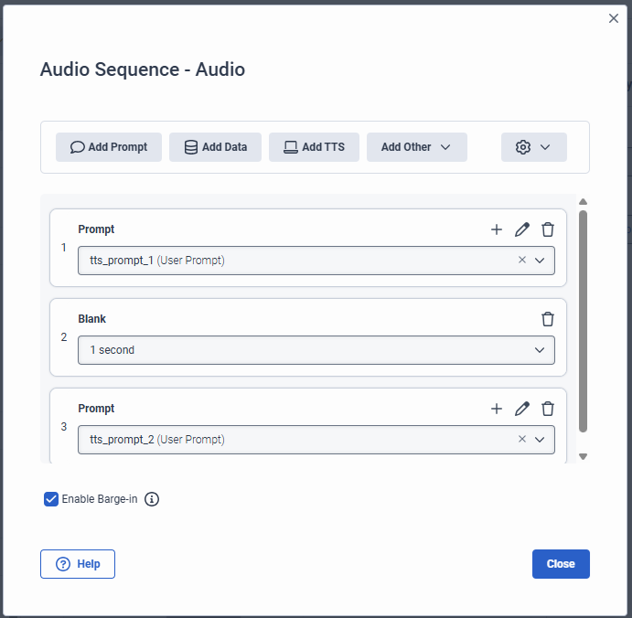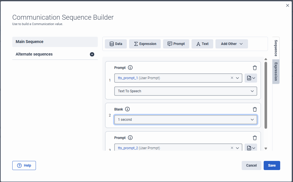 We are playing those TTS prompts back-to-back within a CE43 flow and there is no pause between the two sentences. We have tried adding many forms of punctuation to the end of Prompt1, such as a comma, multiple periods, a dash, etc, but none of that works. We were advised to enter " | $blank.1000 " and that does work within CE43; however, if I then use the same prompt within an Architect flow it will speak out the words "break 1000" as part of the TTS script; which of course we don't want.