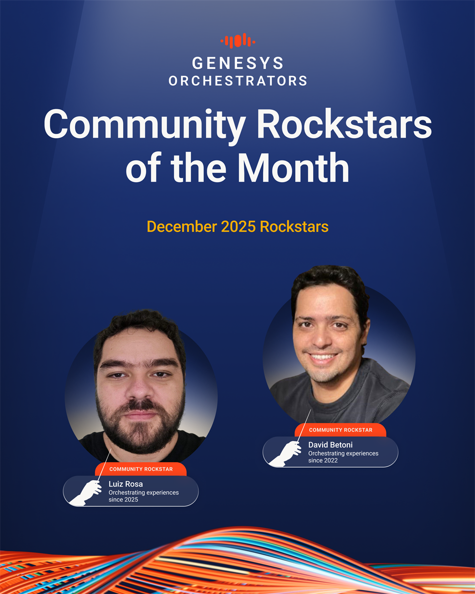 Give a big CONGRATULATIONS to our December rockstars Luiz and David. You make our Genesys Community better with every post you make to help others.