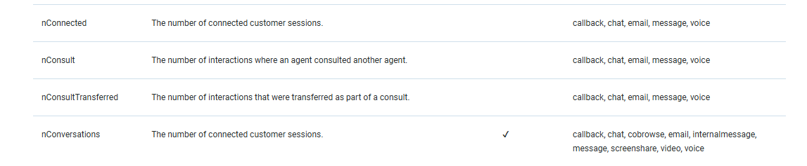Just hoping to find some answers regarding the metric nconversations, which is used in the Channel Insight dashboard. If we look into the documentation page for Genesys -Conversation Aggregate Query the description of nConnected and nConversations metrices are similar with minor differences (media type supported and Preview).