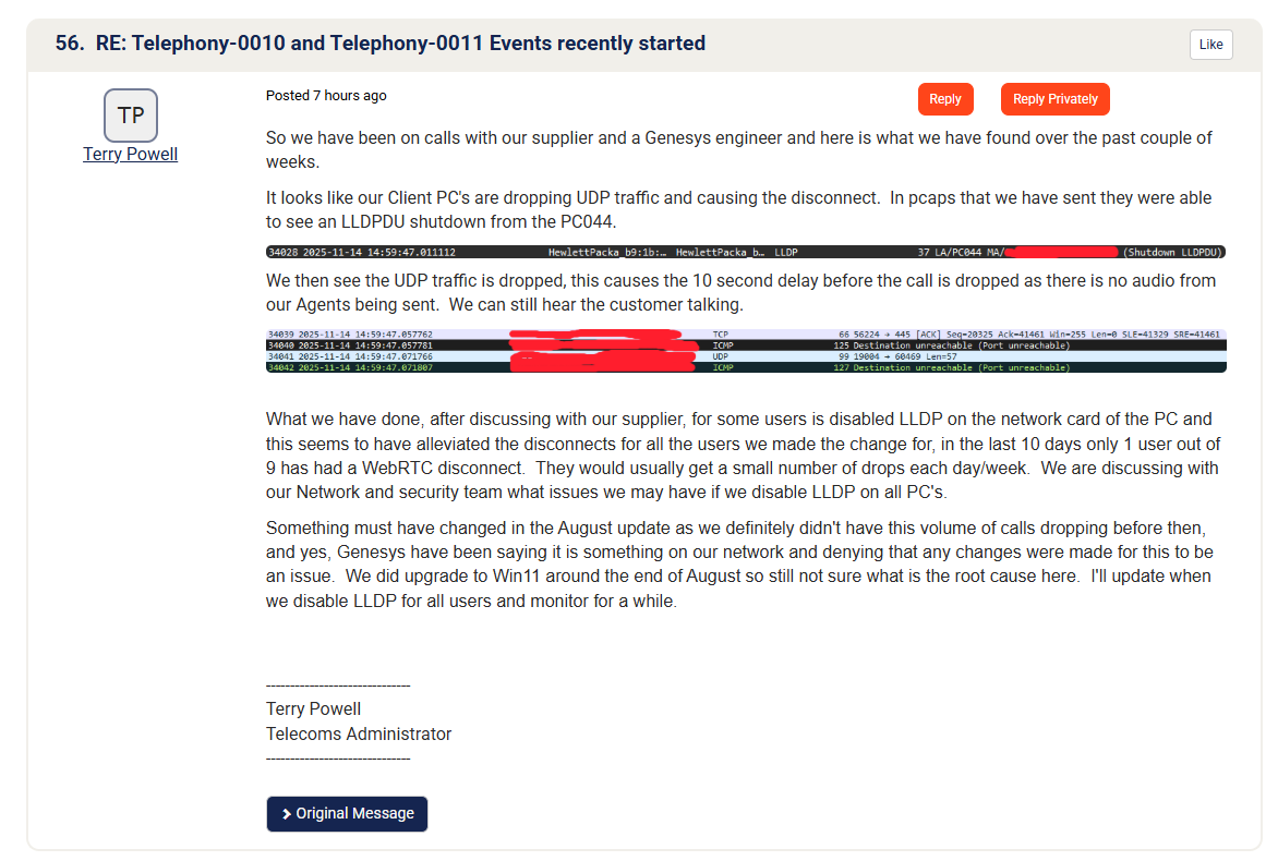 I am glad to have found this thread after experiencing this with one agent for almost 2 months. I have also had 1 supervisor experience it intermittently. Today I had two more agents report this occurring over the past couple of weeks. I had one agent experience it this morning, most of them do have the app close/crash when on a call in the afternoon. We have been going back and forth with our internal IT team and TAC (TTEC support) going back and forth with Genesys with different ideas and suggestions. I have sent numerous logs and none of these points were brought to our attention, so I super appreciate all of your input.