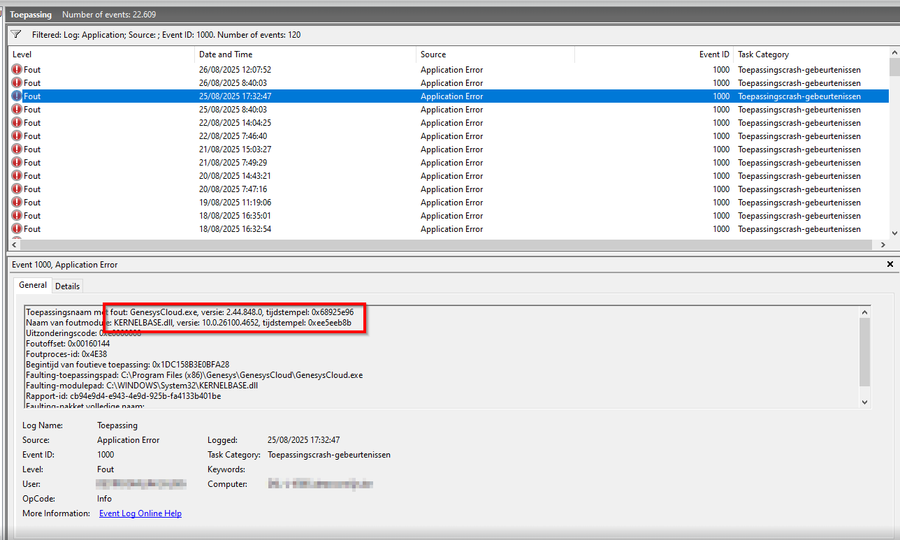 - In Windows Event Viewer > Application Logs we get event ID 1000 error: Application Crashing Event