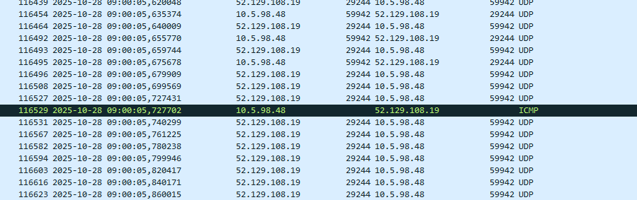 | 11 | | AfdSendToWithAddress | AFD_OPCODE_CONNECTED | 2025/10/28 09:00:05.6953424 | msedge.exe (15424) | verzenden naar: 1: Proces 0xFFFF808B9ADE1080, Eindpunt 0xFFFF808B9CD039C0, Aantal buffers 1, Buffer 0xFFFF808BA199CB80, Lengte 97, Adres 52.129.108.19:29244, Seq 3.202, Status 0xC000009A | 1 |