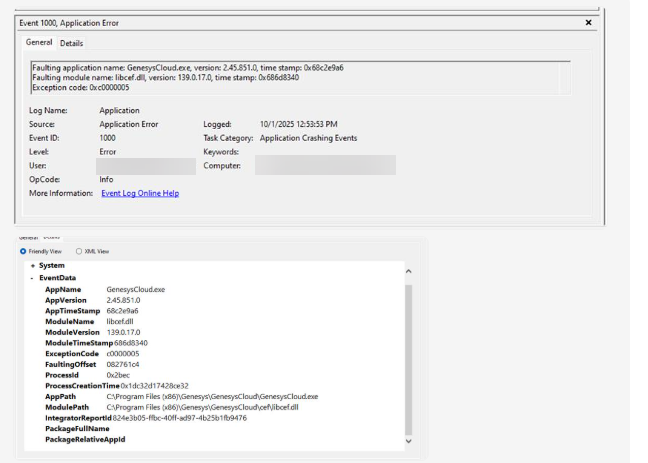 I am glad to have found this thread after experiencing this with one agent for almost 2 months. I have also had 1 supervisor experience it intermittently. Today I had two more agents report this occurring over the past couple of weeks. I had one agent experience it this morning, most of them do have the app close/crash when on a call in the afternoon. We have been going back and forth with our internal IT team and TAC (TTEC support) going back and forth with Genesys with different ideas and suggestions. I have sent numerous logs and none of these points were brought to our attention, so I super appreciate all of your input.