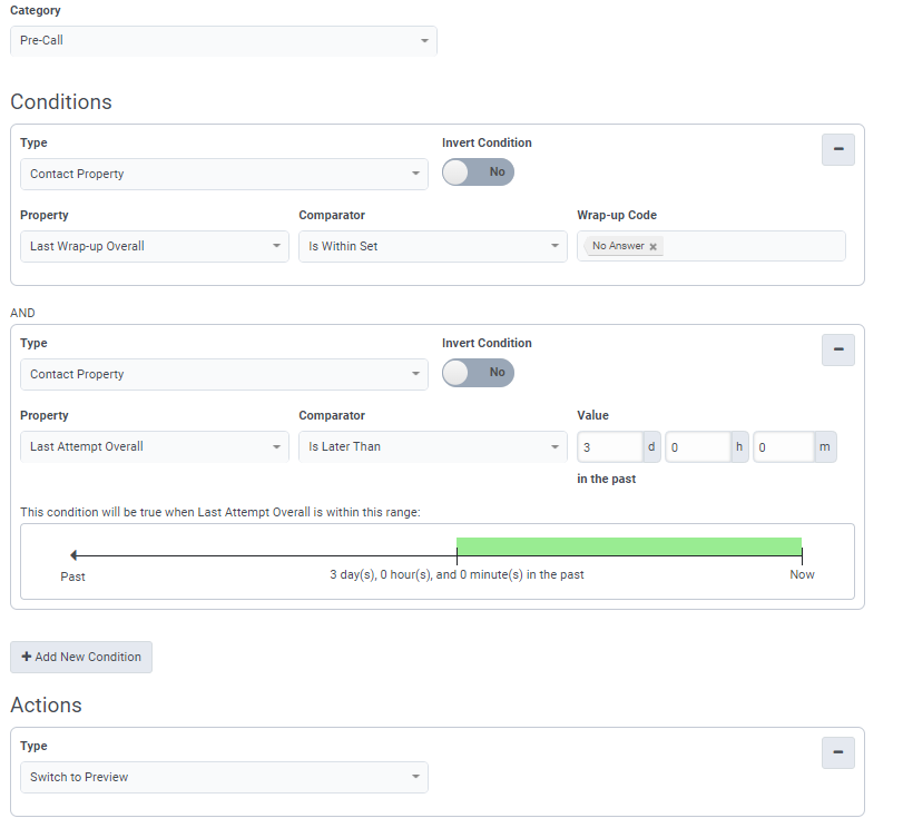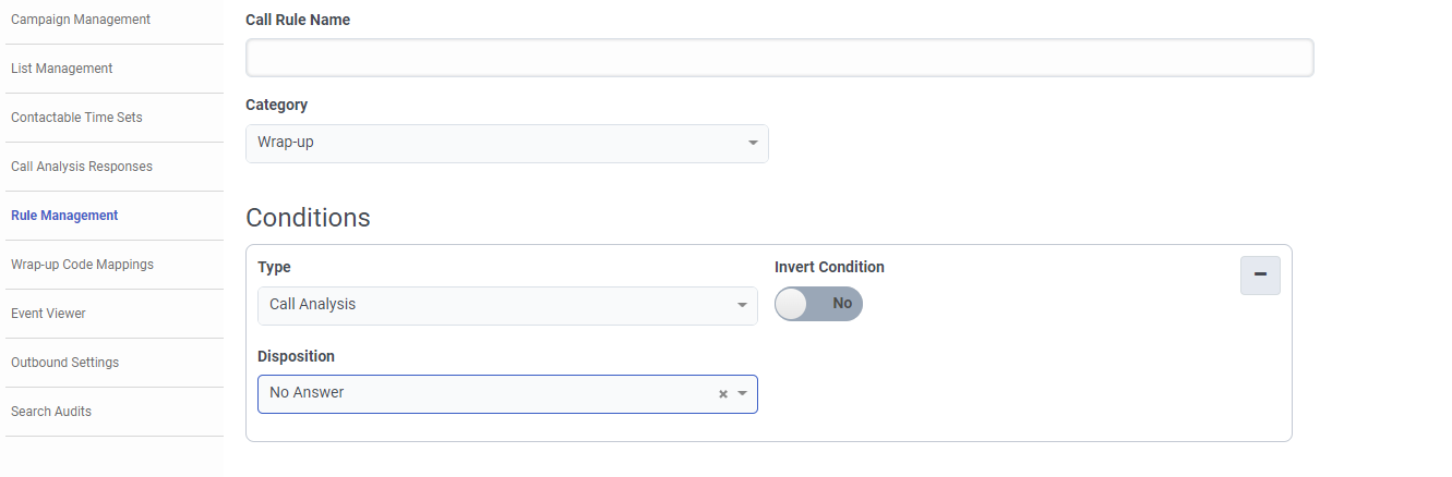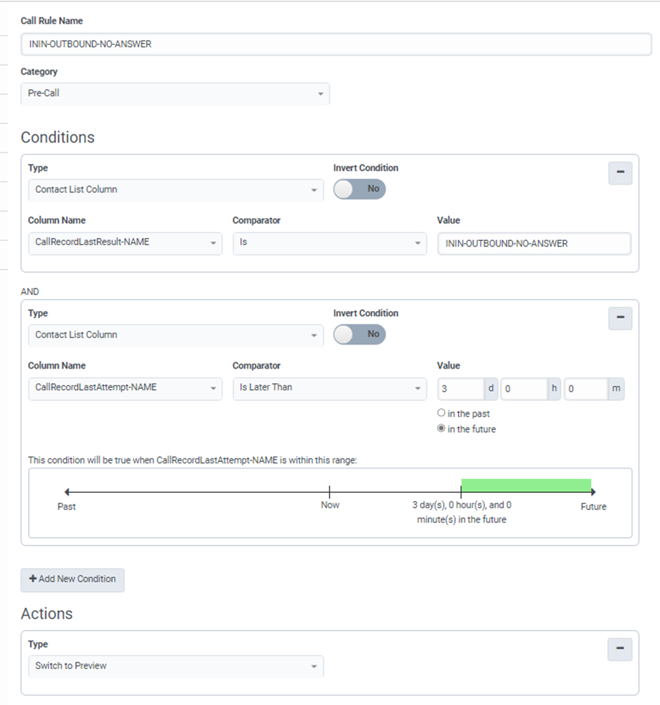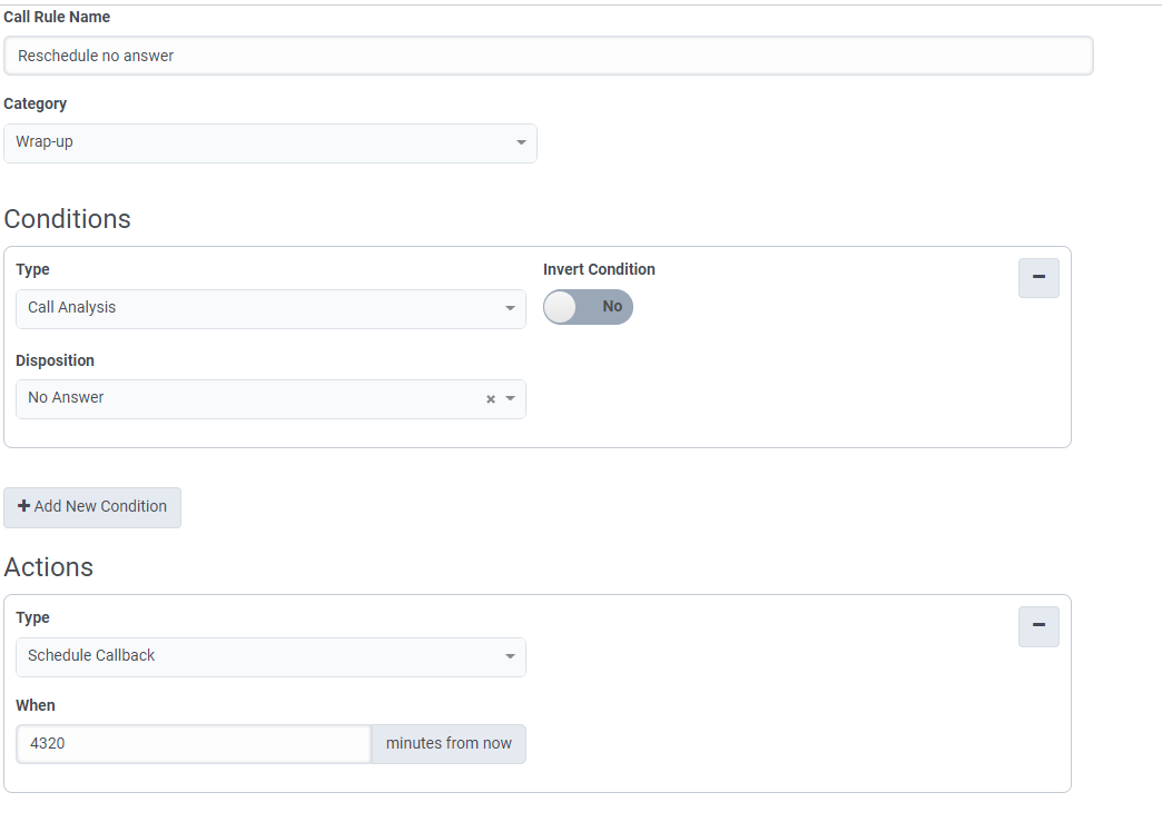 If you need to reschedule a No Answer wrap up to 72 hours in the future you will need to set up a rule to do this.(in this case choose No Answer under Call analysis and set up the rule)