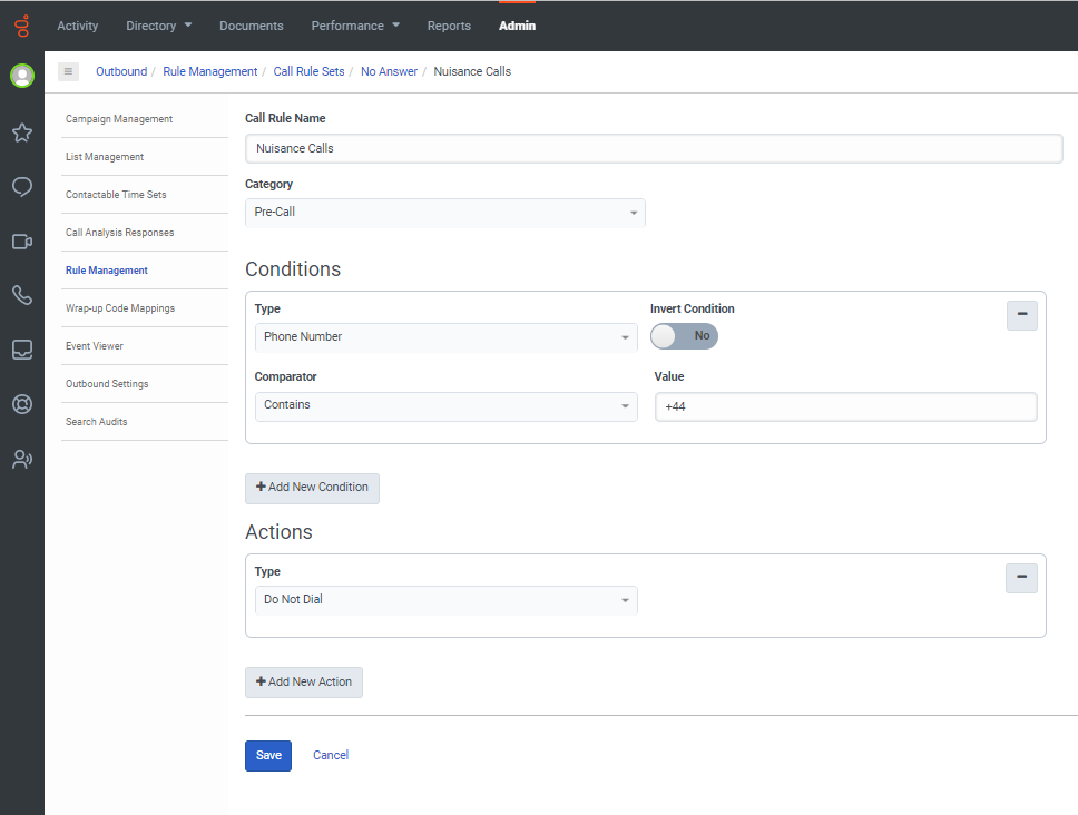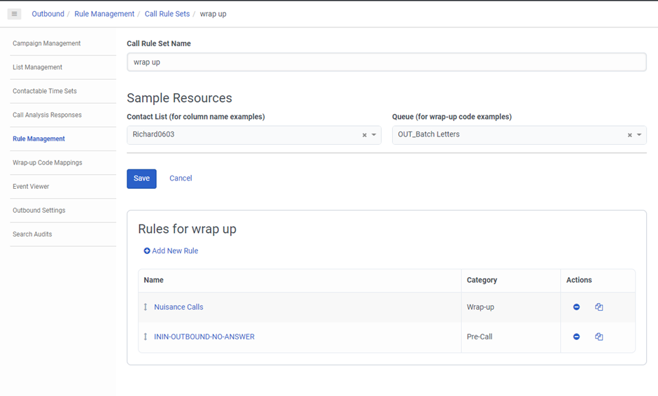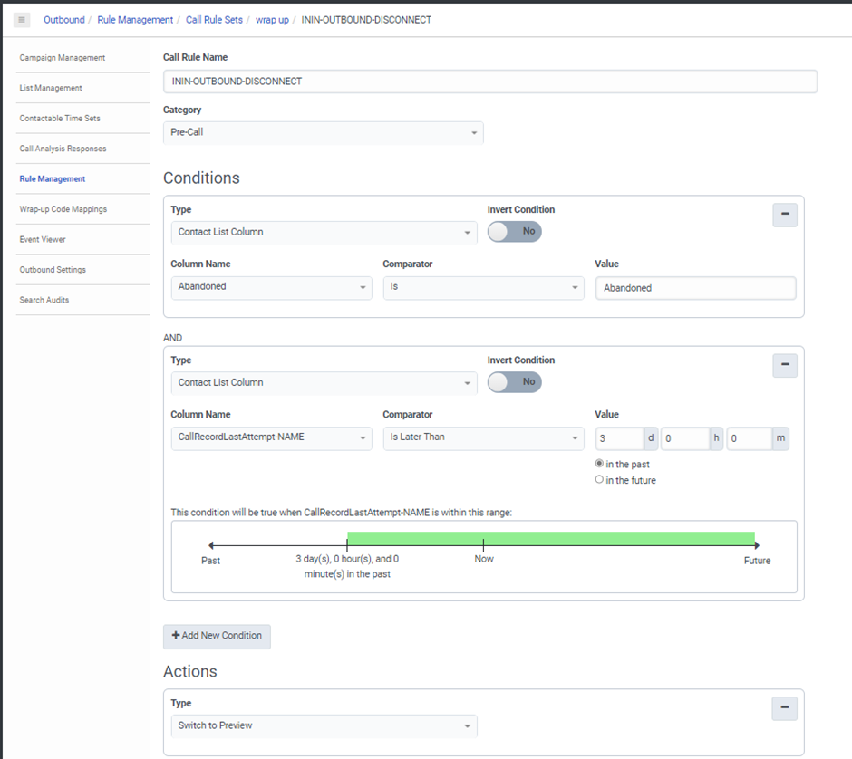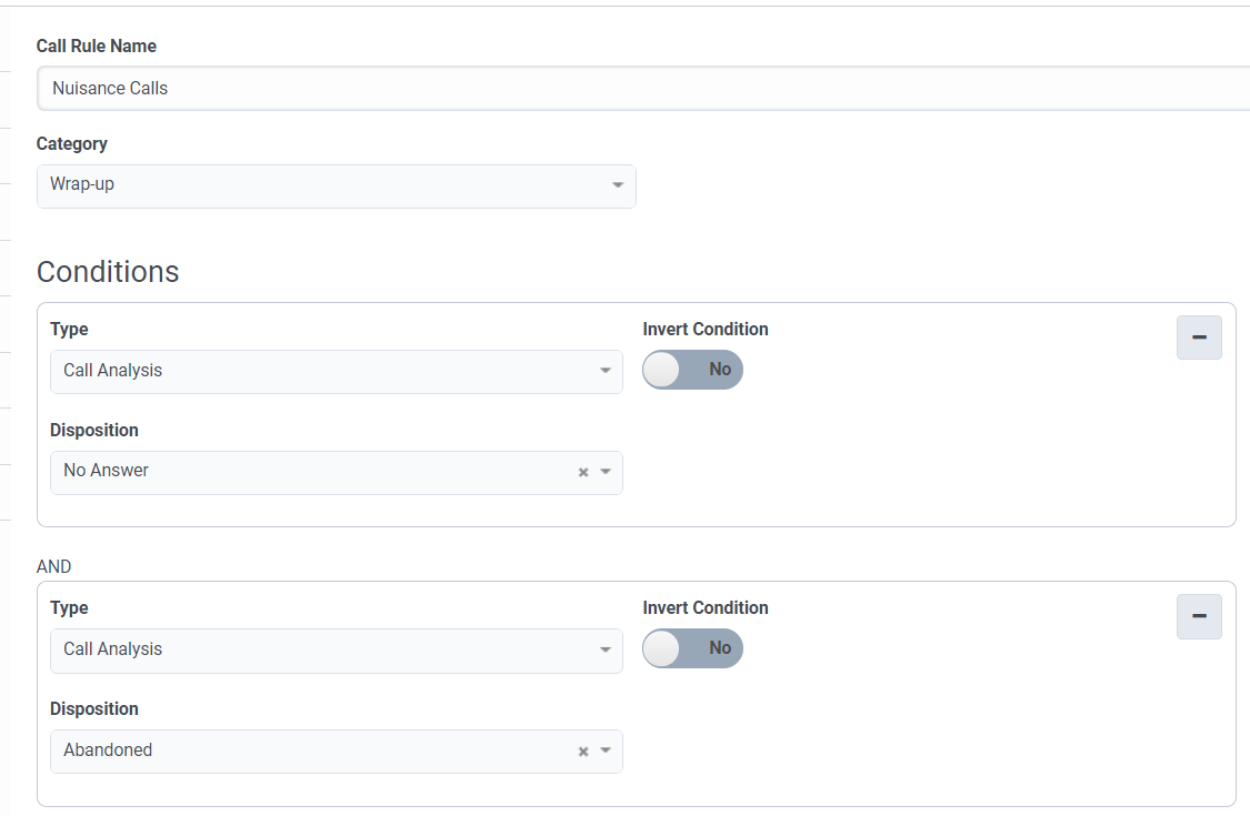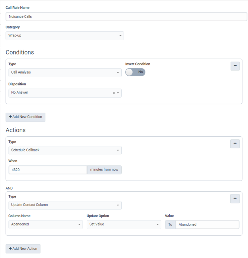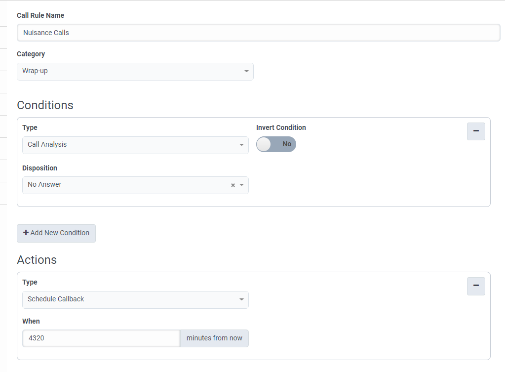i am in the UK and need to ensure that a nuisance call is not called back for 72 hours. Do I need to set something up in Rule Management like the file attached or do i need to do something different ?. As soon as the outbound call connects the customer receives a recorded message stating the purpose of the call and then they are asked to press 1 to connect the call and therefore i need something which will see when the customer doesn't answer the call or disconnects the call however neither are in the disposition list in the rule management section of the attachment. Your help and advice on how to configure would be appreciated.