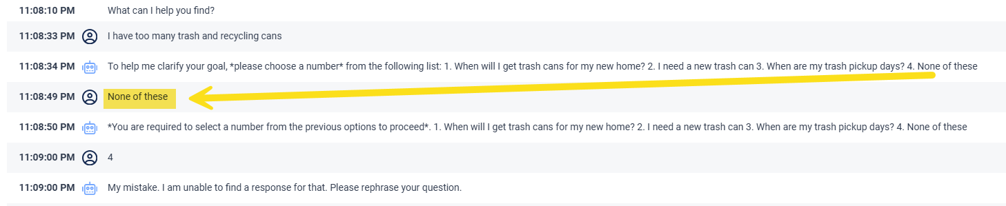 Even if the bot simply allowed the customer to continue a conversation instead of locking them into choosing a Disambiguation option, that would be better than what I see today. If not forced to choose a number to proceed, the customer could continue the bot chat if uninterested in the surfaced articles, or if they type out the title of the desired surfaced article, they would get that associated Knowledge article.
