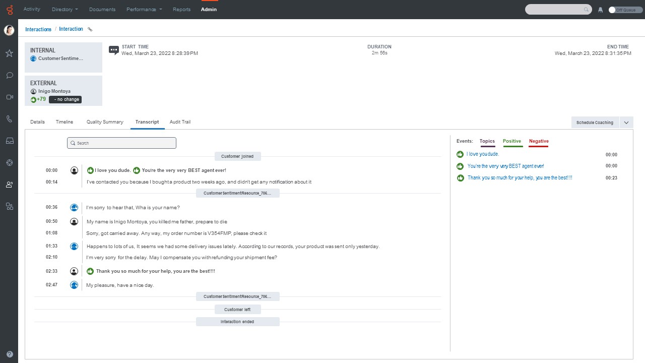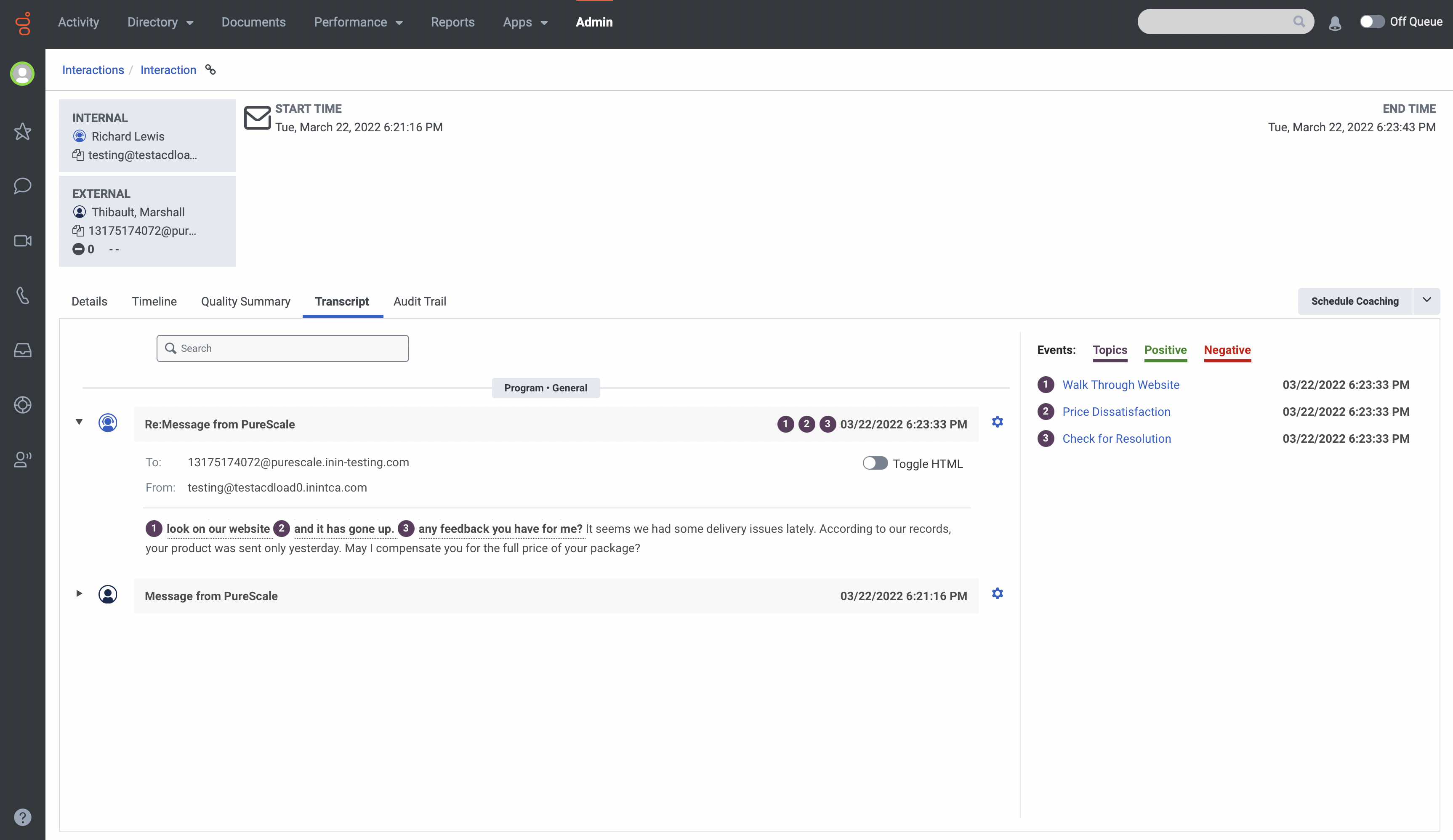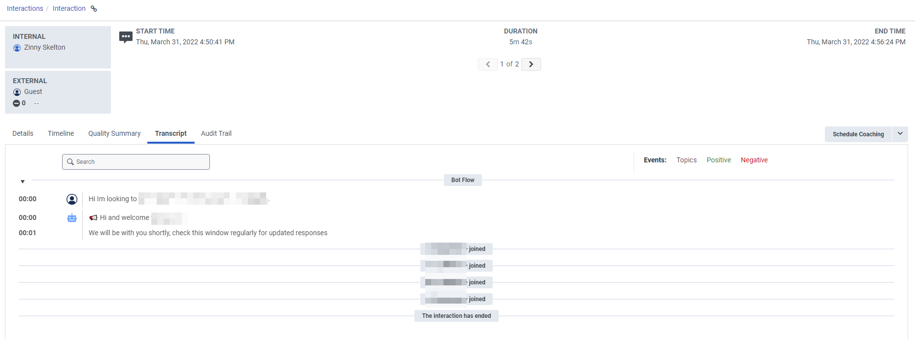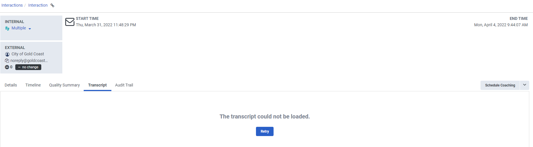 This means that all Digital Interactions (i.e. email, chat, messaging) when viewed in the Interaction Details UI will now reside on the Transcript tab.