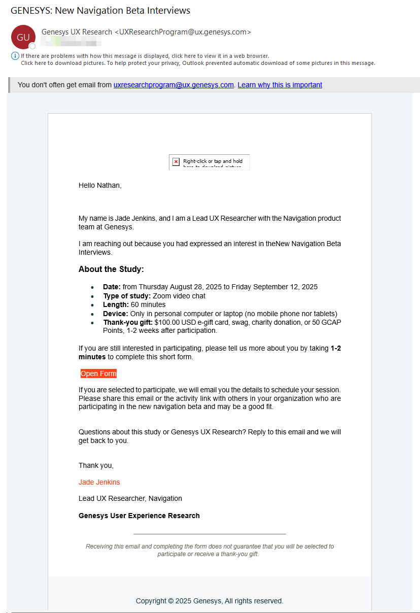 Subject: Email received from Genesys UX Research that looks like a phishing email