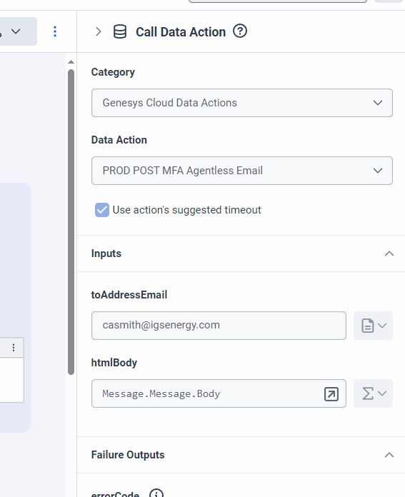 - Create a data action with inputs for all of the below variables you care about within in email. Include the TO address as well. We define the TO address in architect itself on the input for the data action.