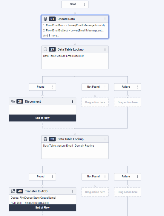 In the flow below, I have a series of tables which will route the emails a queue and assign a priority and skill value.