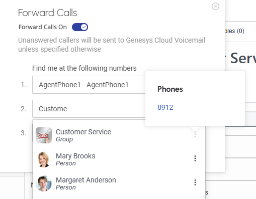 I'm seeing a group which has a phone number configured. I have to click the three dots to select the number I want to forward to...