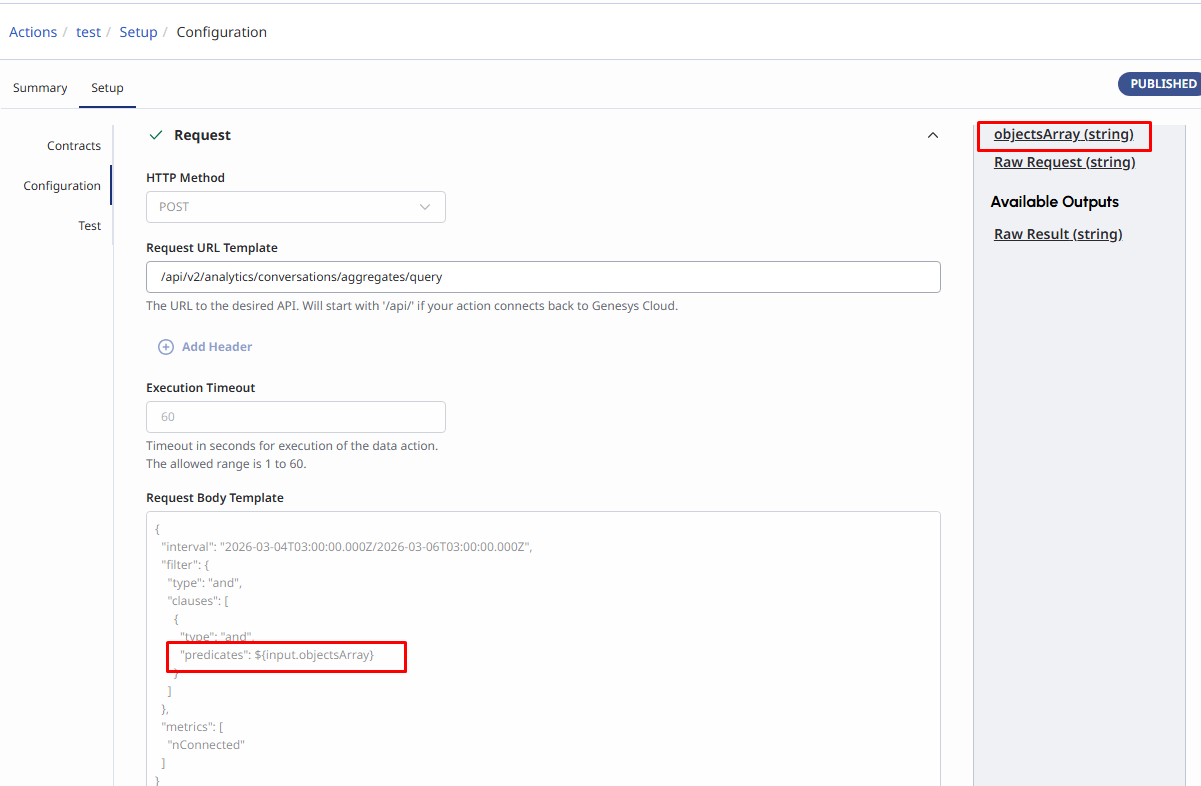 I'm using a Genesys Cloud API (Analytics Aggregates Query) as an example.. Notice that the "predicates" attribute is supposed to be an array of objects.
