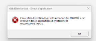 "The unknown software exception (0xe0000008) occurred in the application at GcbaBrowser.exe at location 0xXXXXXXXX."