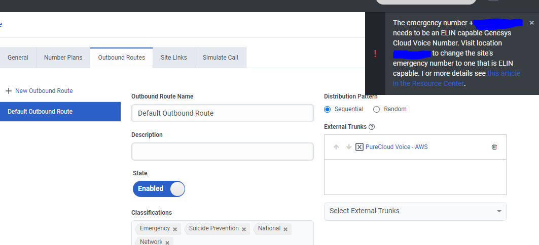 I am getting an error (see below) when trying to enable the outbound route.  I have made sure that the numbers I have tried are ELIN capable but they are NOT Genesys Cloud Numbers.  This is the first time I have tried to enable the outbound route when it is not BYOC so I am sure it is something simple that I am missing.  Any help is appreciated.  Thanks!