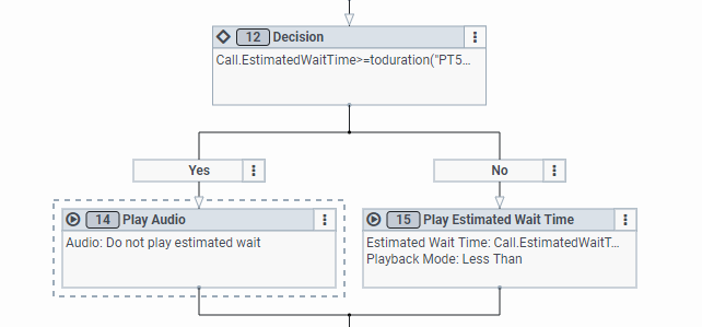 We want to play the Estimated Wait Time only if the EWT is < 5 minutes. In the flow, I have added a decision box with the following rule: