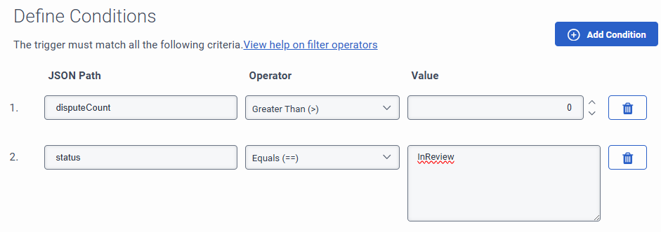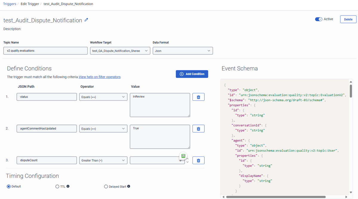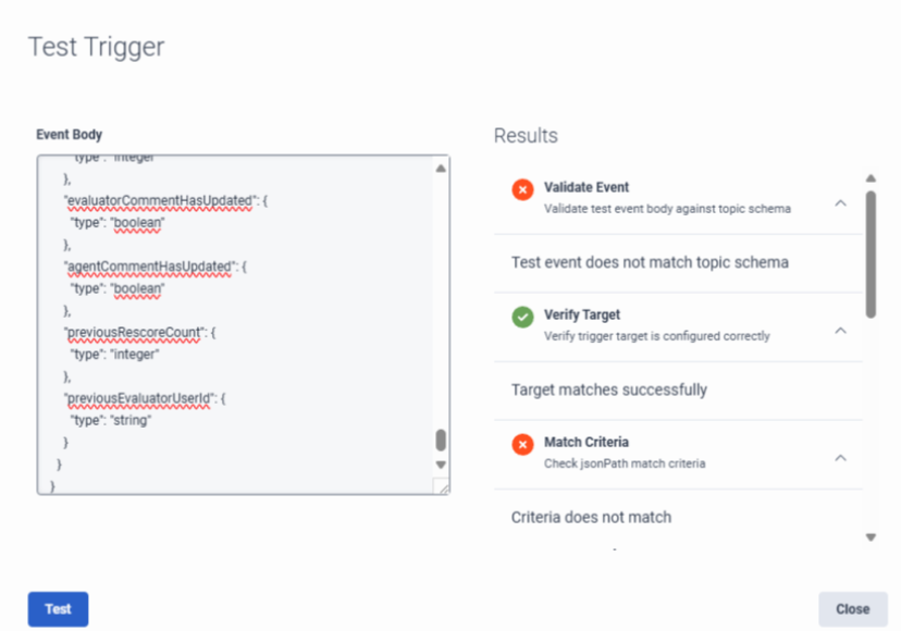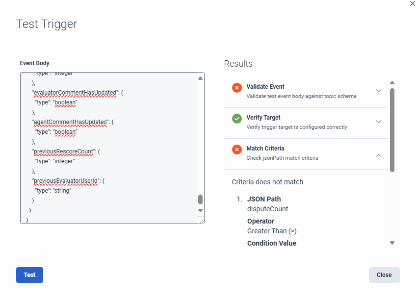 Go ahead and remove condition 2 for agentCommentHasUpdated and then try copying and pasting this JSON into the test event body to see if you can get a success:
