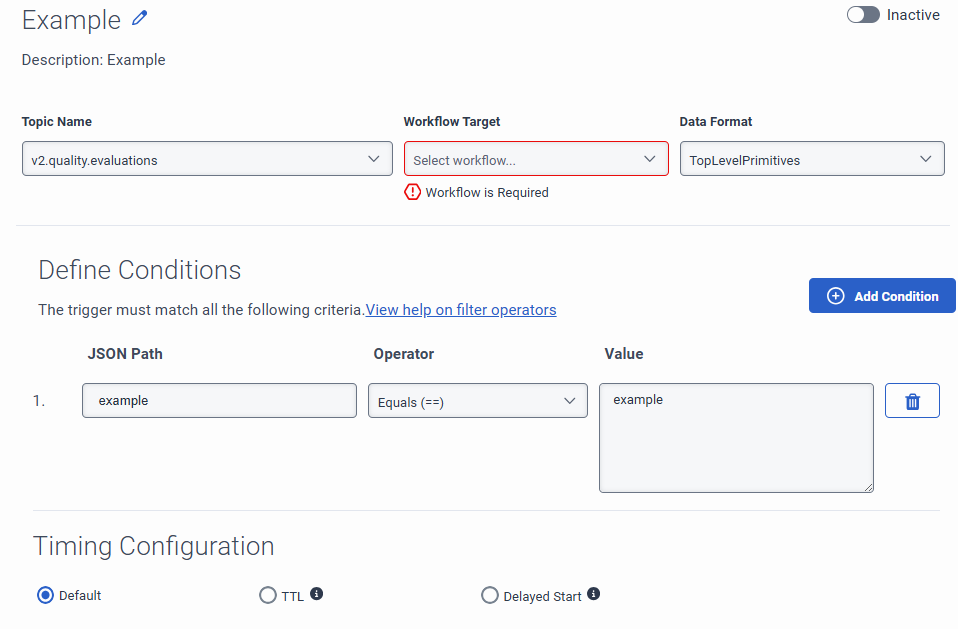 You're looking for the topic v2.quality.evaluations and I personally prefer the Json Data Format because it's easy to setup and utilize once you understand it. This only really matters though if you want to pass the schema data into the workflow.