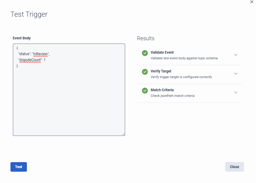 I will say I have already setup this trigger and tested on my own end doing a dispute and it was successful so I don't believe it's the configuration of your trigger. The issue should either be the way the test is conducted, or the workflow.