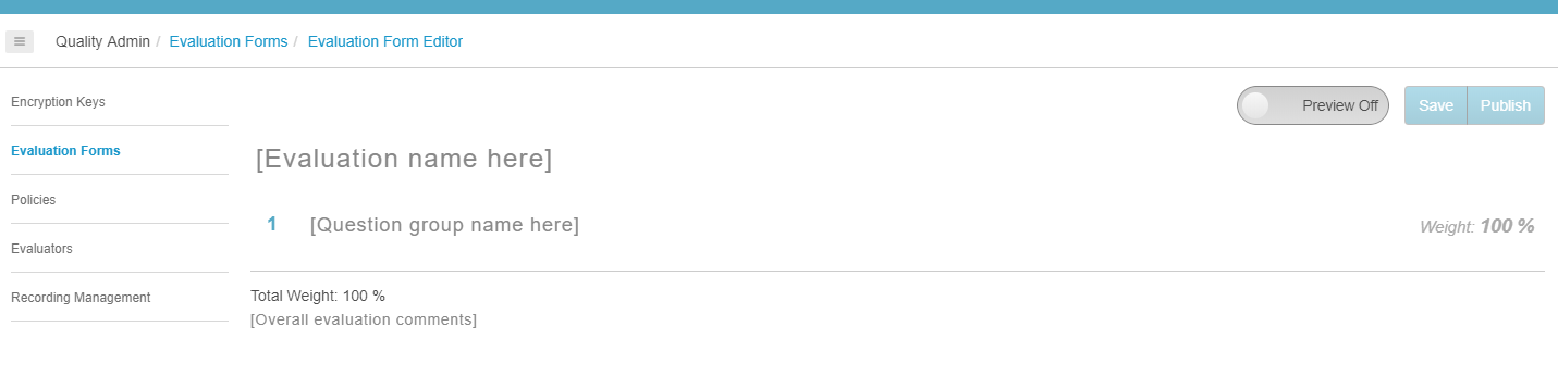 I see from the screen shot that you haven't added anything to the Evaluation Form. Once you have given the Evaluation a Name and added at least one Question Group and One Question the 'Save' button should become active.