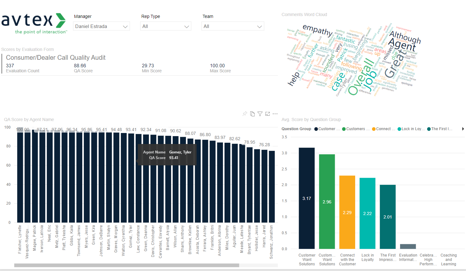 Our clients main focus has been around pin pointing problem areas on any queue, agent question under 90% and then quickly identifying where that problem is so training can be established. The real time evaluation dashboards are keys to quickly identify problem areas before the reporting is conducted. Our clients modify these reports and dashboards as and when their business demands require further enhancements. Below are some of what our clients have requested and we have completed: