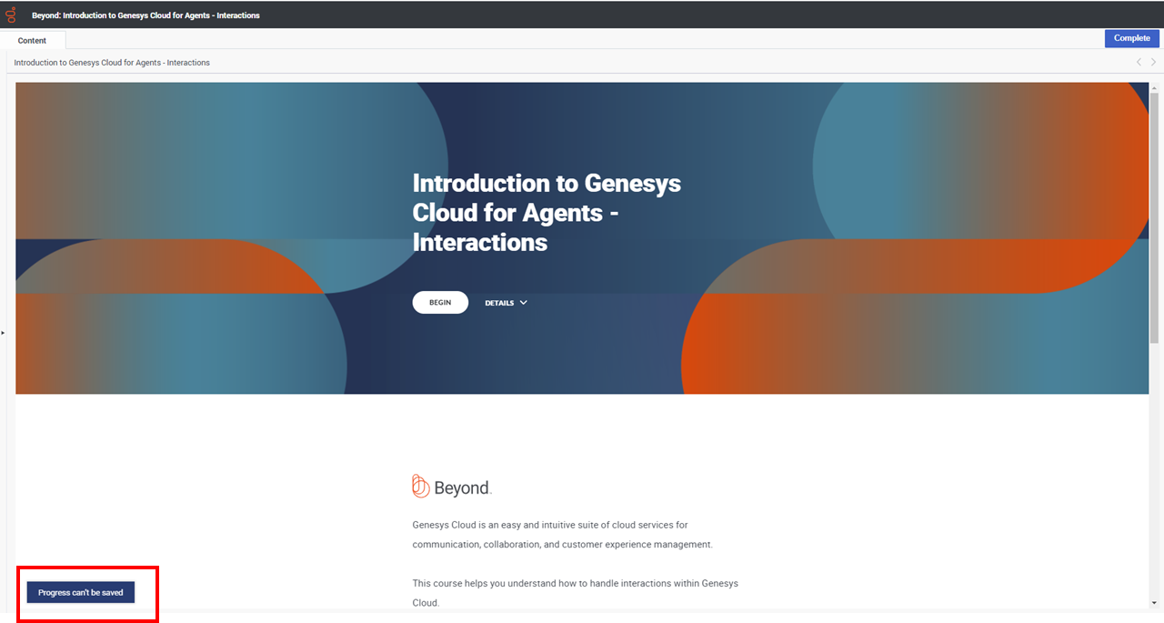 At the moment this is because the Beyond content within Genesys Cloud is loaded in to Genesys Cloud, there isn't at the moment a link into the Beyond system etc. So the control of completion here at present is entirely based on a user selecting 'Complete' (top right)