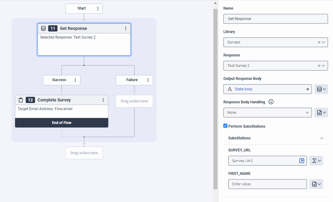 Use the Action Get Response (under Data) to select the Canned Response which would also include your signature. Select substitutions for your survey URL and other data pulled from the interaction such as customer name, time of call, agent spoken to etc.