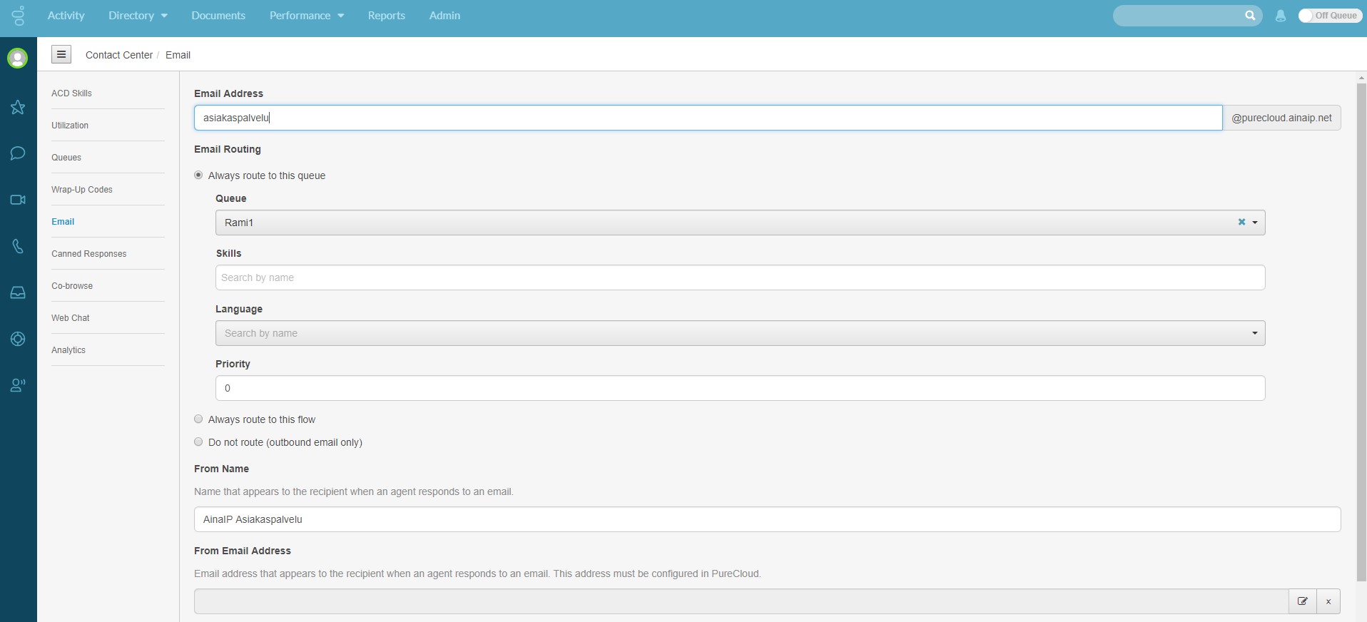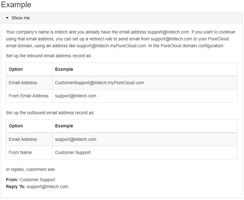 I'm having a trouble setting From Email Address and Email Address addressed with customer domain, not subdomain. I always end up in a dead end, because address must be configured in Purecloud. I don't want to configure the customer domain in Purecloud as it will then forward all customer domain email to purecloud via DNS.