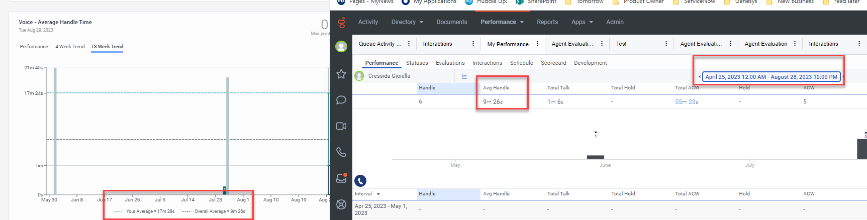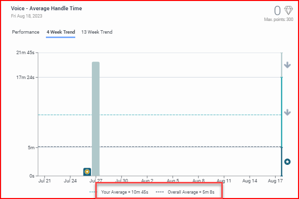 If my assumptions are accurate, my data is accurate in workspace > my performance. Select the past 4 weeks and I do not have any interactions in play as I am not actively on q. I see my average handle time is 5m 8s which matches. It also matches day over day to the gamification scorecard.