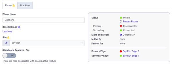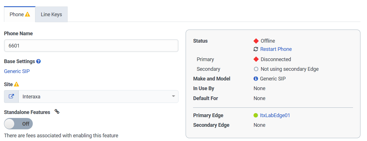 - Created a "Phone" named "6600". Selected the "Generic SIP" base settings. Specified its site.