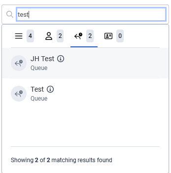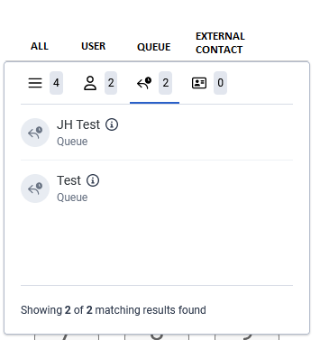 It doesn't really matter if we are in the users or queues or external contacts, when searching it should show results to all objects