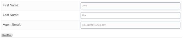 <table class="webchat-config"> <tbody> <tr> <th>First Name:</th> <td><input type="text" id="first-name" value="John" /></td> </tr> <tr> <th>Last Name:</th> <td><input type="text" id="last-name" value="Doe" /></td> </tr> <tr> <th>Agent Email:</th> <td><input type="text" id="agent-email" value="alex.agent@example.com" /></td> </tr>