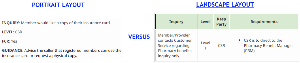 - A: Great question that I'm sure other community members have various opinions on. We have tried both PORTRAIT and LANDSCAPE layouts. As clean as the table format is, it can be challenging to copy/paste/format those tables from our outside source documents, answer-highlighting doesn't work as well (if at all with tables), and the new multi-panel columnar format for the Agent Workspace scrunches up the table to the point where it's hard for our agents to scroll & read both horizontally and vertically. As such, we stuck with the vertical format given it plays better with the multi-panel config, is easier to format, & answer highlighting works fairly consistently.