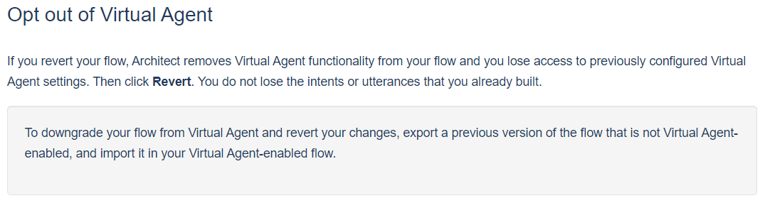 And this bit added: Which hopefully means if we revert we keep the generated intents and phrases? But then why make us enable virtual agent to use it?