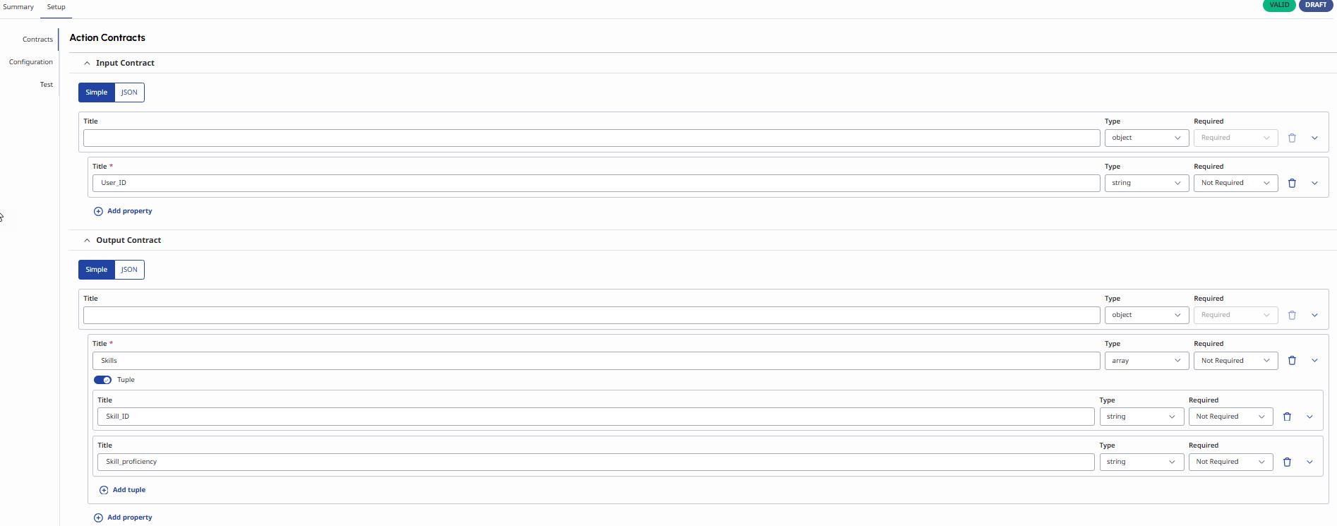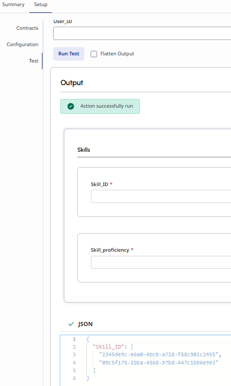 The "id" and "proficiency" fields are arrays. In this case, you can define the output contract like this: