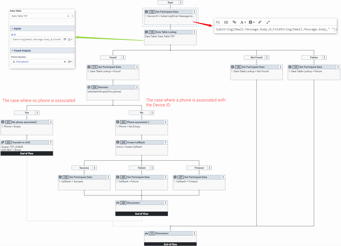 The same formula is used as an input for The Data Table in order to look for the Device ID. Then store the Phone Number found in a variable called Flow.Phone