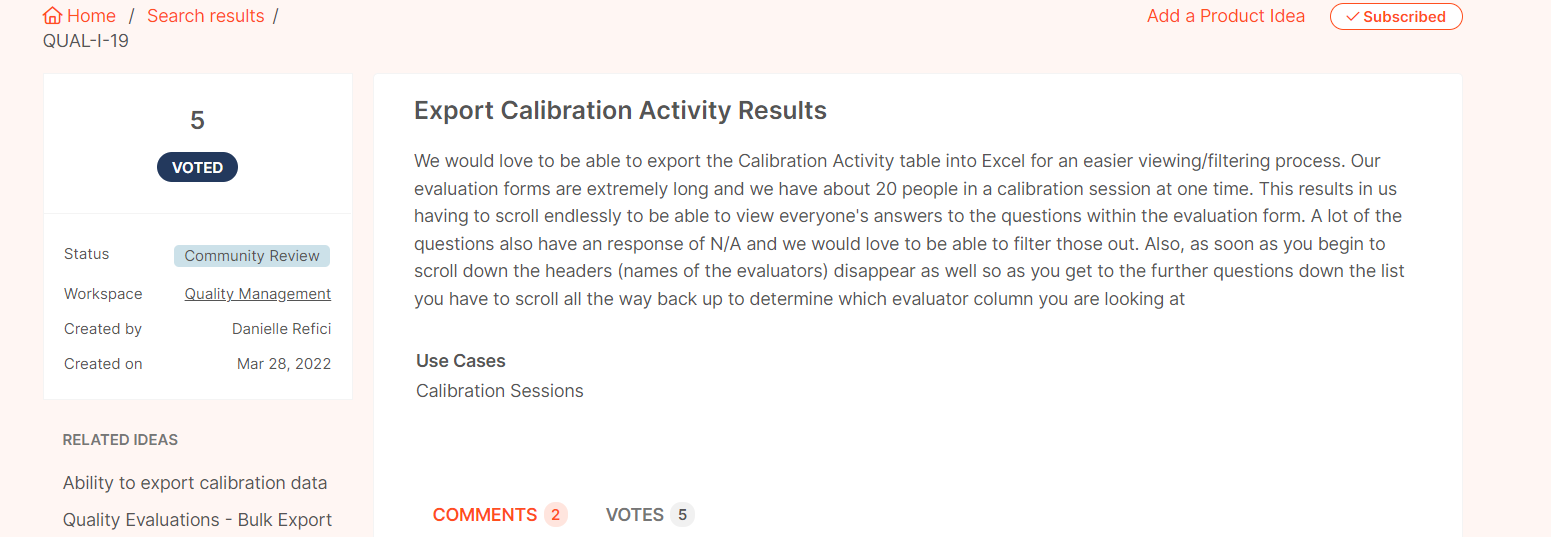In our contact center, we have 6 evaluators that participate in calibrations. Currently when reviewing discrepancies, we have to manually look at each one which is very time consuming. This idea requests for it to be able to be exported into excel/CSV for easy review.