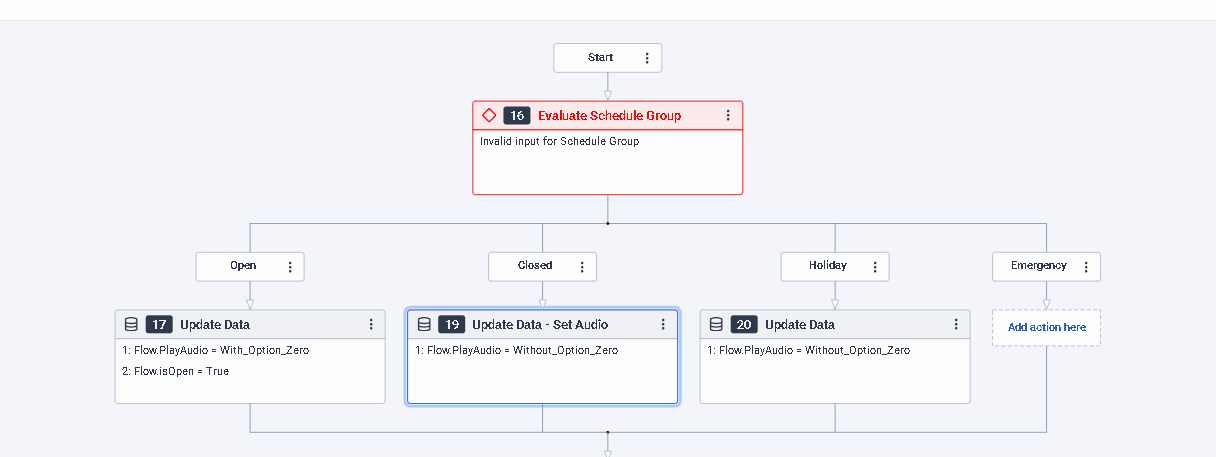 The first step is to validate the scheduler group and create a variable, for example, flow.PlayAudio.