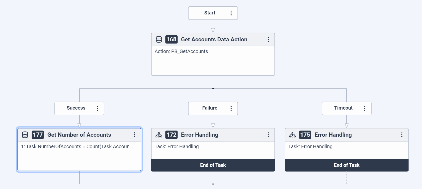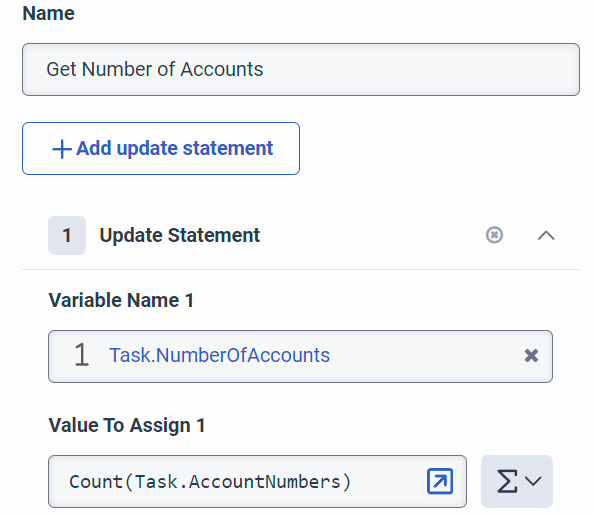 Data Action returns an array of accounts (as string array) and I assign that to a Variable called Task.AccountNumbers