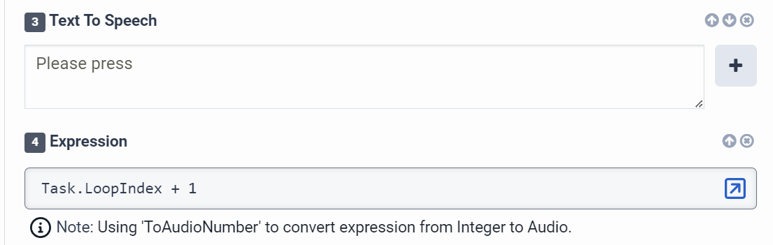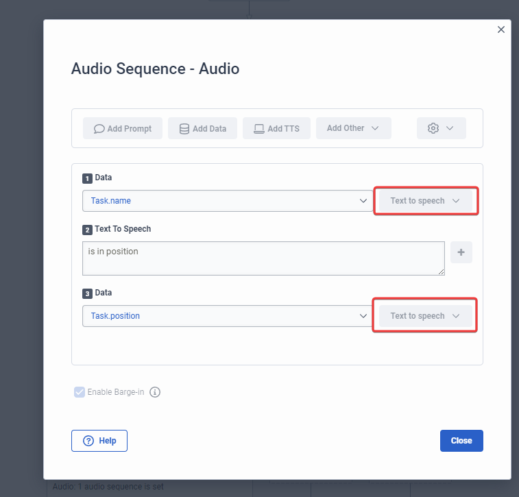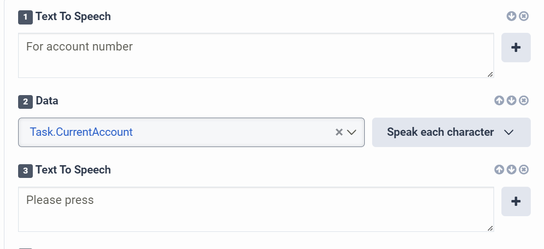 The data action outputs two variables "Task.position" and "Task.name". When I play back the variables in TTS using the Play Audio action, I can opt to have them spoken. Same for collect input / any action with an audio input.