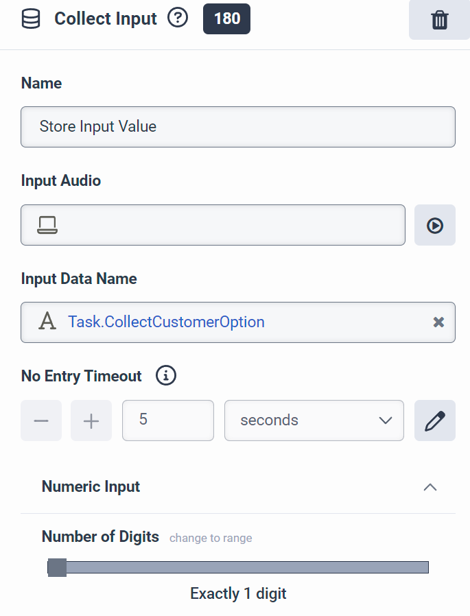 Then the Collect Input is outside the loop (input barge allows it to skip out of the loop to the input block. But you could put the collect input in the loop and add an exit loop action if there is an input). Because we put it outside, we just make the input audio blank. But assign the Input to a variable eg Task.CollectCustomerOption